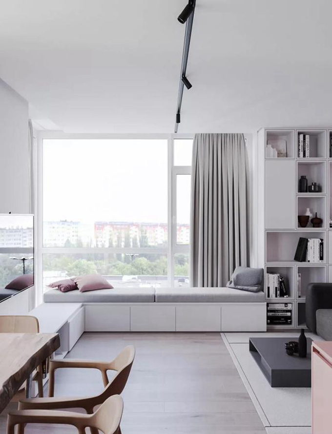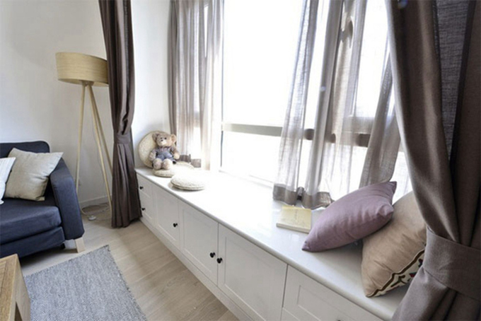 2、墙面不能砸掉的可以选择在飘窗上方加入抽屉格,搭建柜子和隔板都是不错的选择,这样可以合理利用空间,放一些随手取用的东西。